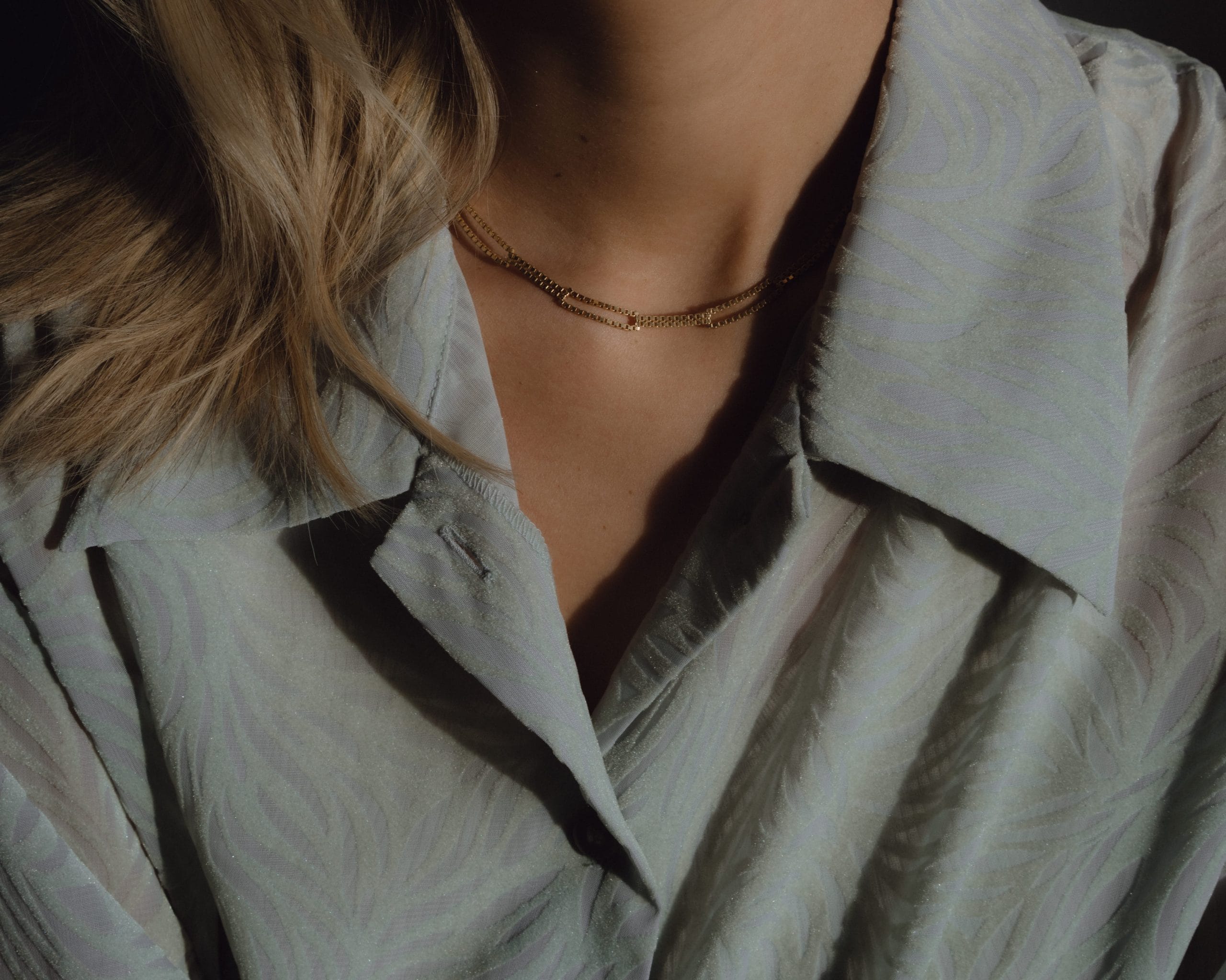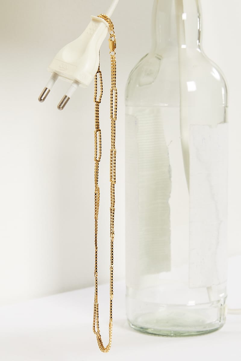 The Fair and Square Necklace features a repeating pattern of squares, crafted from strands of Venetian chain for a structured yet fluid design. Made from sterling silver 925/000 or gold-plated sterling silver 925/000, it measures approximately 42 cm in length, 5 mm in width, and is finished with a lobster clasp. Handmade in Rotterdam.