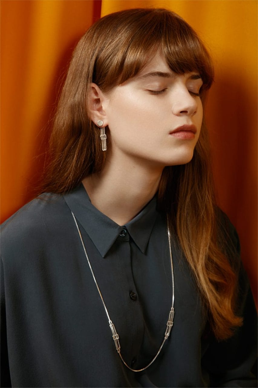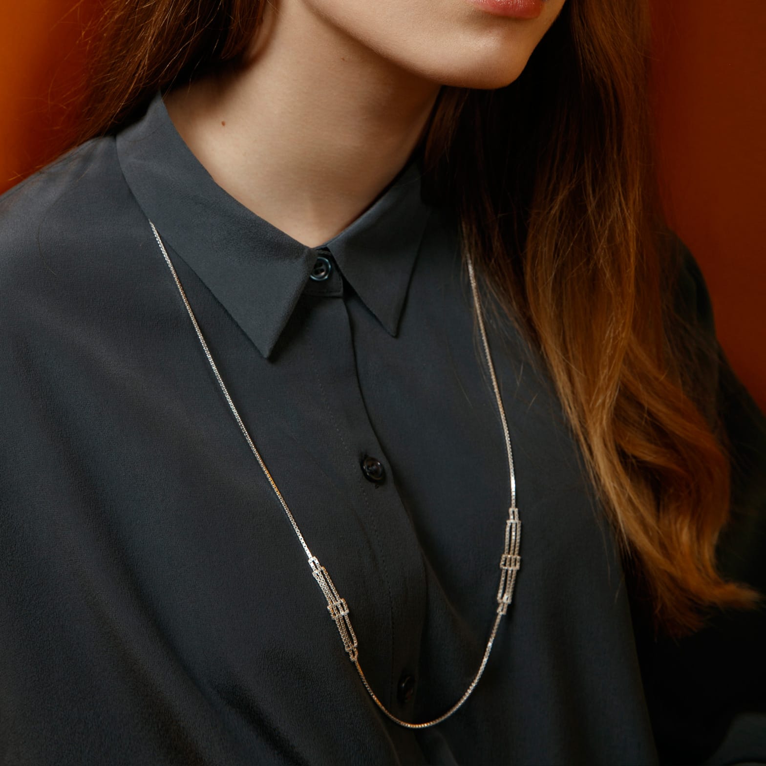 The Octavia Necklace features an integrated pattern on both sides, crafted from a single piece of Venetian chain. Its 9 mm wide design, made from strands of 1.5 mm Venetian chain, creates a seamless, flowing look along its 60 cm length. Made from sterling silver 925/000 or gold-plated sterling silver 925/000, it is finished with a lobster clasp and handmade in Rotterdam.