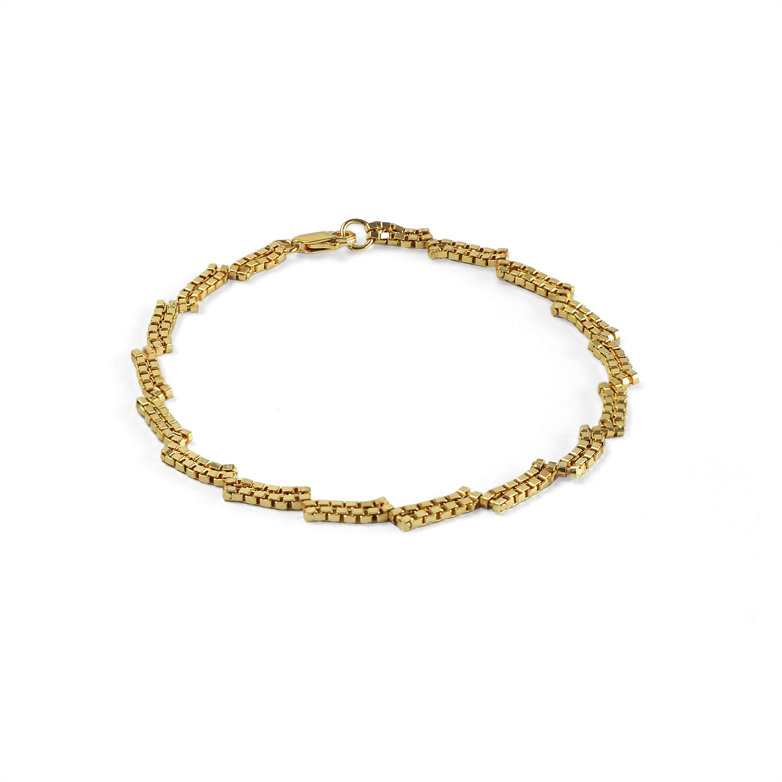 The Zigzag Bracelet features a unique, handcrafted link created from Venetian chain, forming a striking zigzag design. Made from sterling or gold-plated silver, 3 mm wide, and available in 17 or 18 cm with a secure lobster clasp. Handmade in Rotterdam.